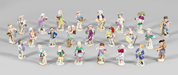 24-tlg.; Auf rocaillereliefiertem Sockel stehende Amorettenknaben und -mädchen, verkleidet u. a. höfische Dame mit Muff, mit Triangel, Harlekinette (Columbine) mit Pritsche, Hirtenmädchen, Fischer, Bergmann, Bäcker und Kavalier. Polychrome Malerei mit Goldstaffage. Entw. Michel Victor Acier, um 1775. Teilw. minim. best./Unw. rest.; Schwertermarke. H. 9 cm - 10,5 cm.