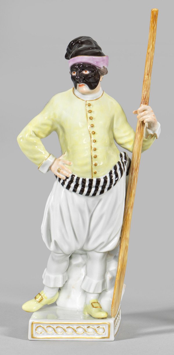 Auf quadratischer Plinthe stehender Komödiant in gelb-weißem Kostüm mit dunkelbrauner Mütze und schwarzer Maske. In der linken Hand ein Holzruder haltend. Polychrome Malerei mit Goldstaffage. Entw. Johann Joachim Kaendler. Modell-Nr. 64569. Schwertermarke. H. 20,5 cm.
