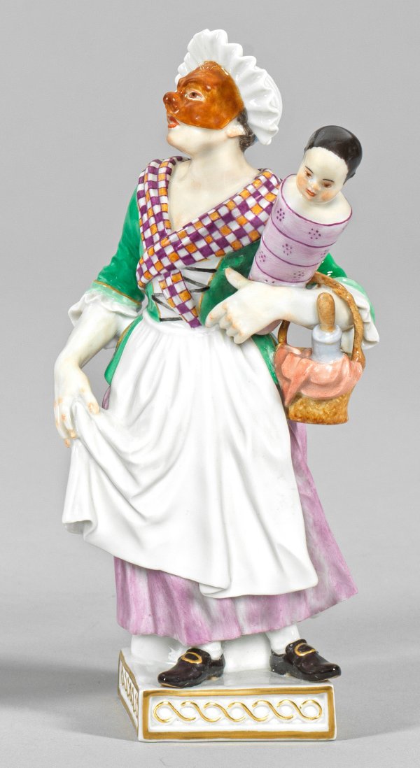 Auf quadratischer Plinthe stehende Komödiantin in rosafarbenem Rock, grünem Mieder mit brauner Maske und Spitzenhaube. Im linken Arm ein Fatschenkind und einen Korb tragend. Polychrome Malerei mir Goldstaffage. Entw. Johann Joachim Kaendler. Modell-Nr. 64563. Minim. rest.; Schwertermarke. H. 18,5 cm.
