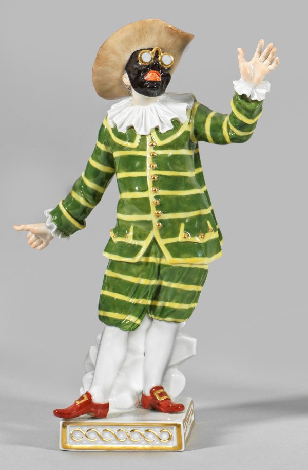 Auf quadratischer Plinthe stehender Komödiant in grünem, gelb gestreiftem Kostüm mit weißer Halskrause, schwarzer Maske und großem Hut sowie Zwicker auf der Nase. Polychrome Malerei mir Goldstaffage. Entw. Johann Joachim Kaendler. Modell-Nr. 64570. Schwertermarke. H. 18,5 cm.