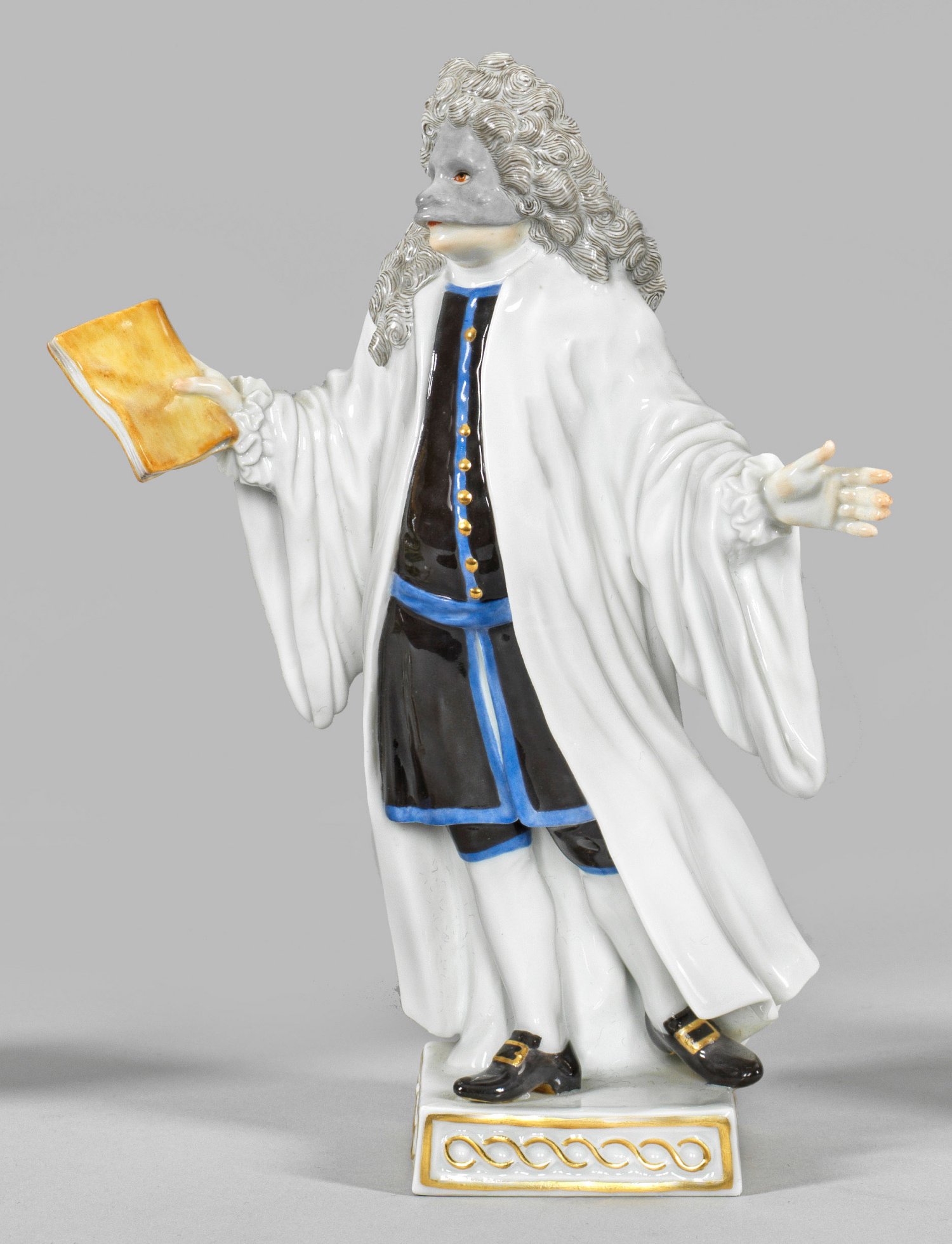 Auf quadratischer Plinthe stehender Komödiant mit Allongeperücke in schwarzem Kostüm mit langem weißem Mantel und grauer Maske. In der rechten Hand ein Buch haltend. Polychrome Malerei mir Goldstaffage. Entw. Johann Joachim Kaendler. Modell-Nr. 64565. Schwertermarke. H. 18,5 cm.