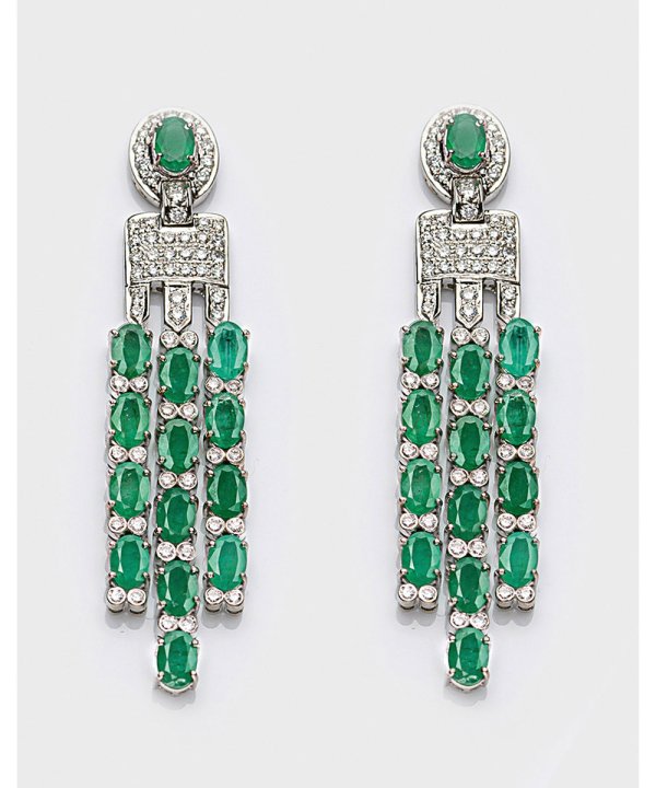 Pair of earrings set with emeralds approx. 11,55 ct. and brilliants approx. 2,23 ct., in 18 k white gold.