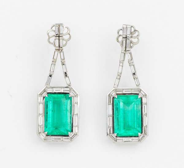 Pair of earrings set with Columbian emeralds approx. 16,80 ct. and diamonds approx. 6,00 ct. (F-G/vvs), in 18 k white gold.