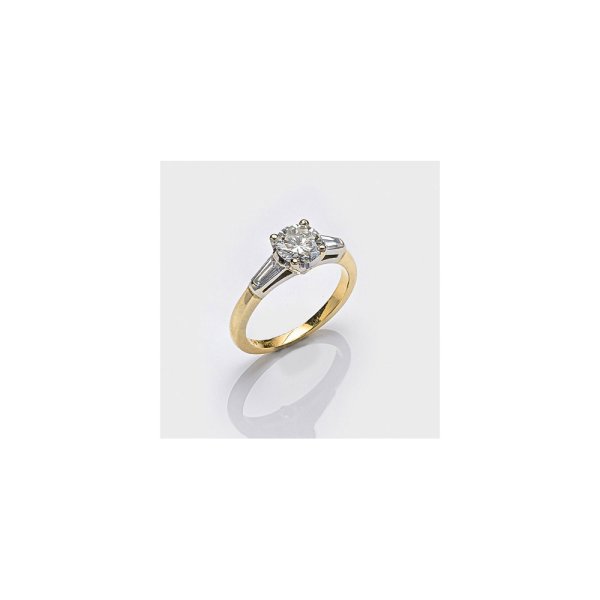 Gelbgold, teilw. platiniert, gest. 585. Zentral besetzt mit einem Brillantsolitär von ca. 0,89 ct. (F-G/vvs), flankiert von 2 Diamanttrapezen von zus. ca. 0,30 ct.; Gew. ca. 2,91 g.