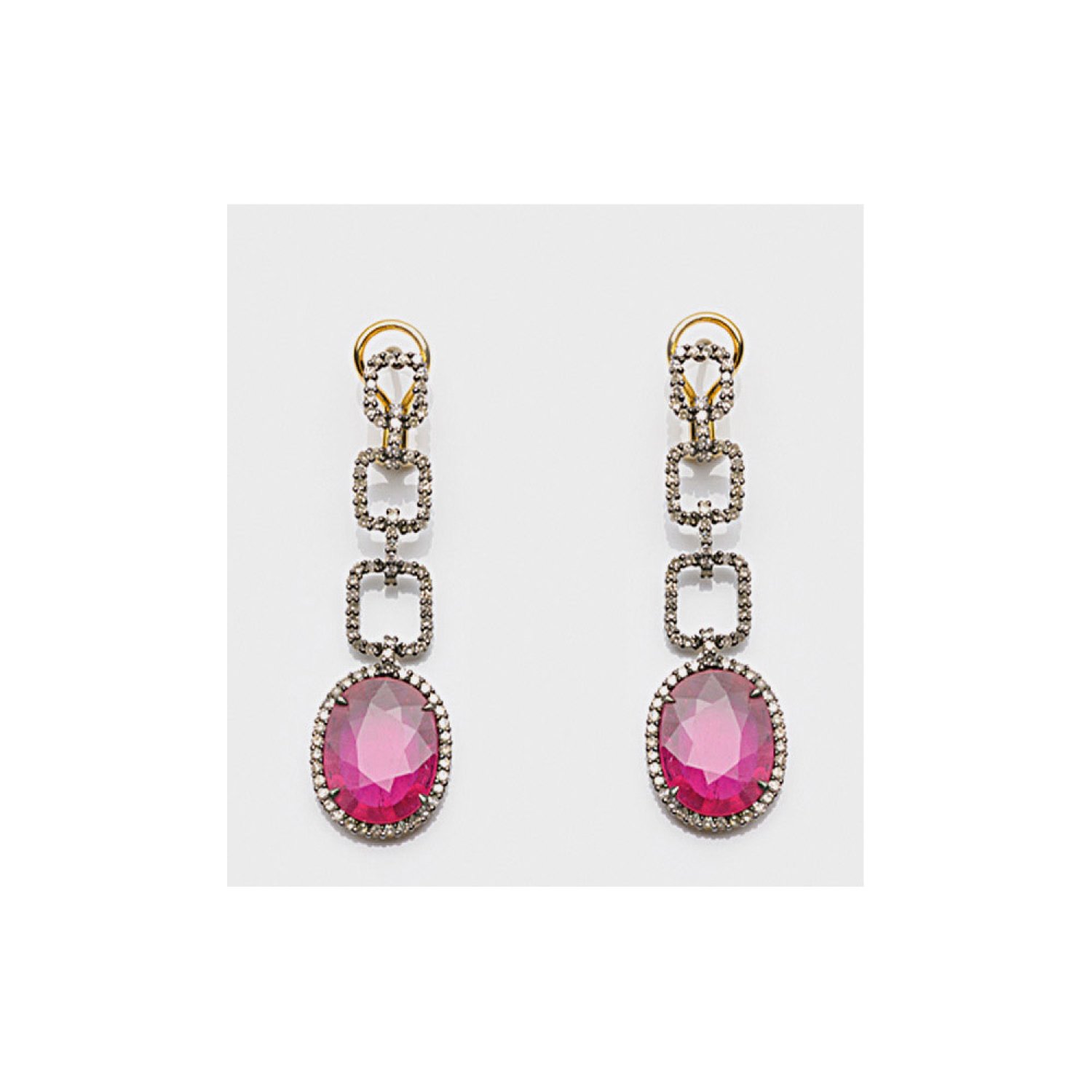 Pair of Russian earrings set with diamonds approx. 1,97 ct. and 2 pigeon blood red rubies approx. 16,05 ct., in silver and 14 k gold.