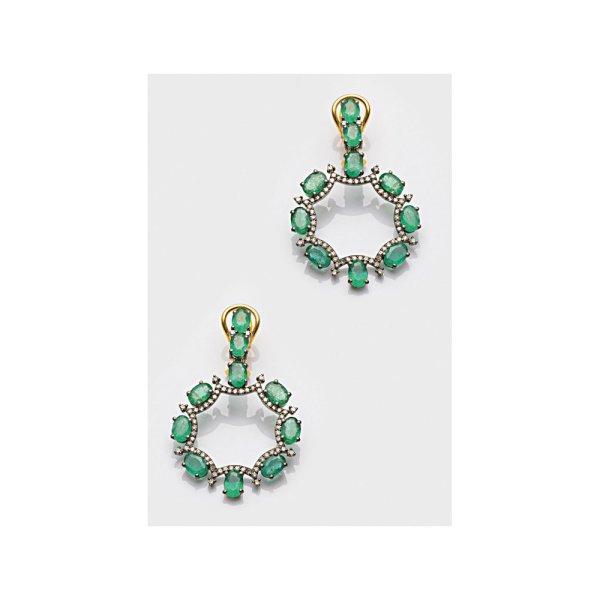 Pair of earrings set with emeralds approx. 19,73 ct. and diamonds approx. 1,00 ct.; in 14 k gold and silver.