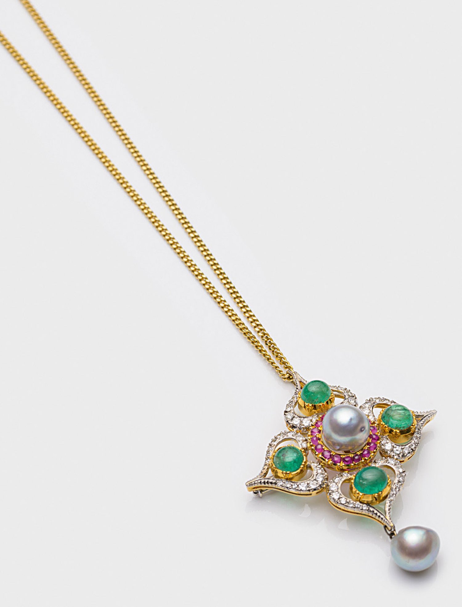 Gelbgold, 18 ct., teilw. mit Weißgold verbödet. Schauseitig besetzt mit 4 Smaragdcabochons, Rubincabochons, 2 grauweißen Barockperlen in sehr farbintensivem, rosé-grün changierendem Lüster und Brillanten von zus. ca. 1,00 ct.; mit Gliederkette. Ges.-Gew. ca. 20,99 g.