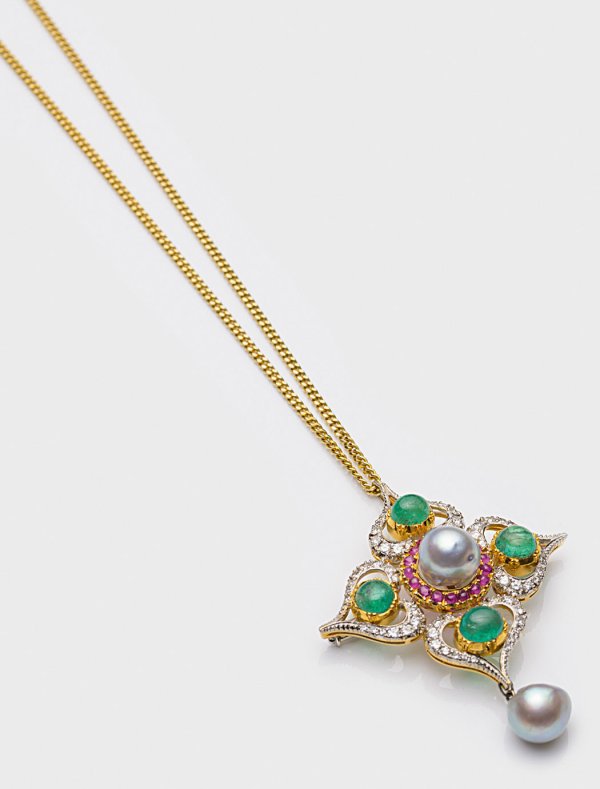 Brooch set with 4 emeralds, rubies, two grey culture pearls and diamonds approx. 1,00 ct., in 18 k gold. With necklace.