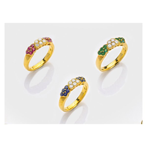 Three multicolour rings set with emeralds, rubies and sapphires approx. 1,50 ct. and brilliants approx. 0,90 ct. (F-G/vvs), in 18 k gold.