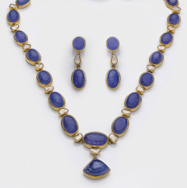 Collier und korrespondierendes Paar Ohrgehänge. Silber, vergoldet. Schauseitig besetzt mit violettblauen Tansaniten von zus. ca. 90 ct. im Cabochonschliff, unterteilt durch Diamantrosen von zus. ca. 4,00 ct.; Ges.-Gew. ca. 122,01 g.
