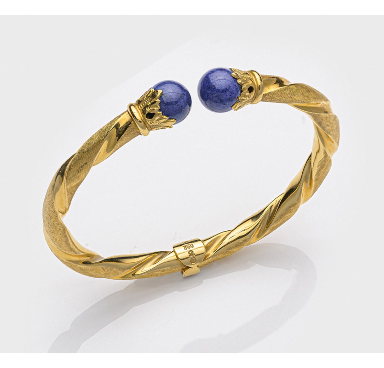 Gelbgold, gest. 750. Gedrehte, teilw. mattierte Schiene mit Klappscharnier, offene Enden besetzt mit je einer Lapislazuli-Kugel von ca. 10 mm. Goldschmiedearbeit. Gew. ca. 24,77 g.