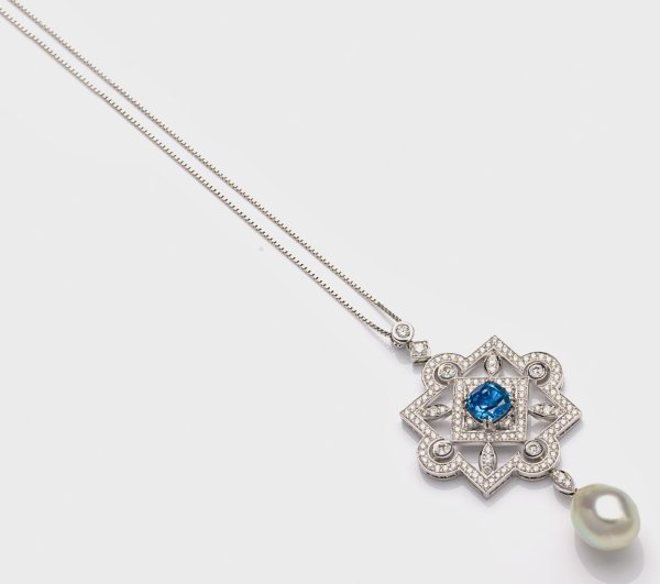 Weißgold, 18 ct.; Medaillonförmiger Anhänger ausgefasst mit Brillanten von ca. 2,02 ct. sowie zentralem Saphir von ca. 2,89 ct. im Kissenschliff, abschließend silberweiße Südsee-Zuchtperltropfen in sehr farbintensivem, rosé-grün changierendem Lüster, an feiner Milanesekette in Silber. Ges.-Gew. ca. 16,30 g.