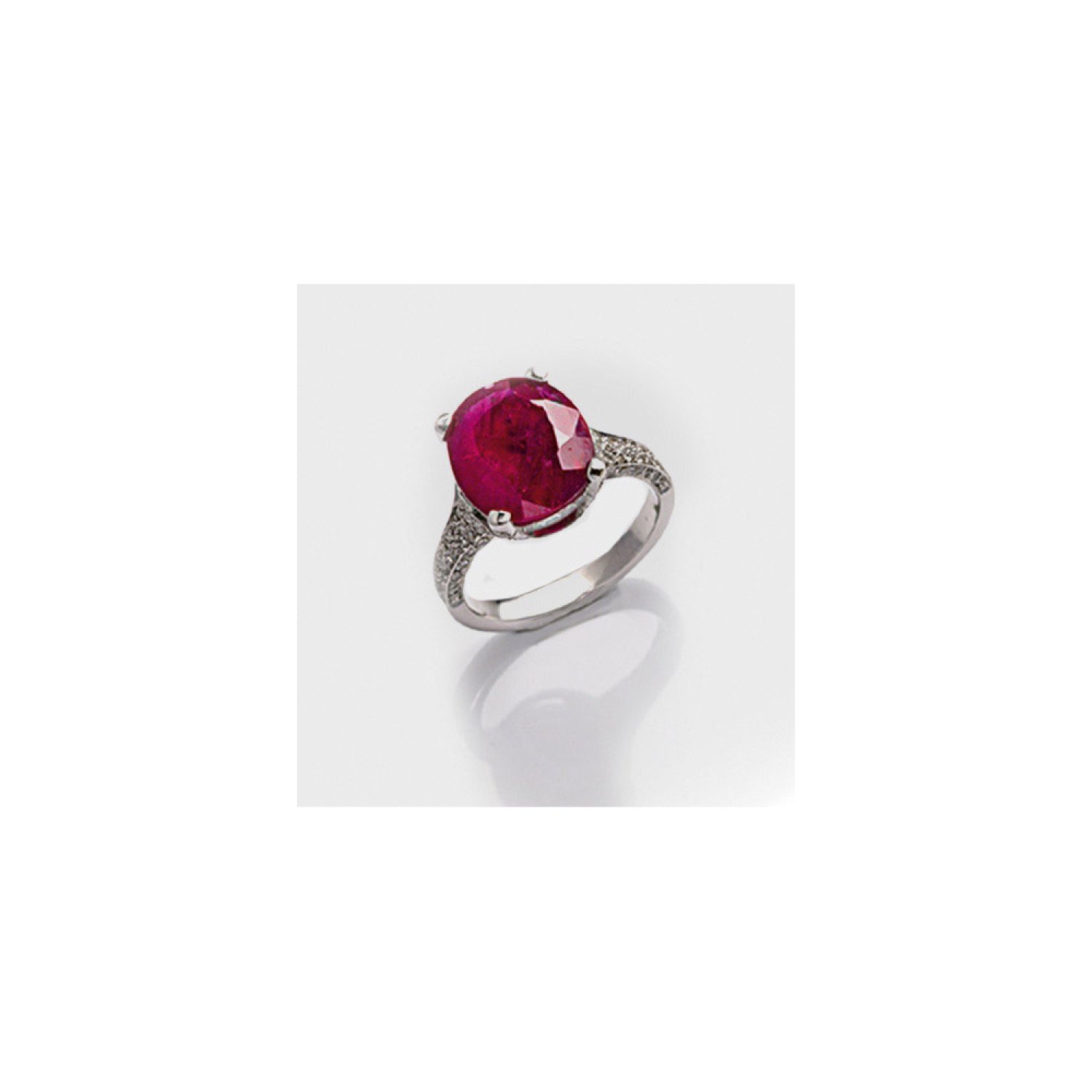 Ring set with a pigeon blood red ruby (no indications of heating) approx. 6,21 ct. and diamonds approx. 1,00 ct., in 18 k white gold. Certificate included.