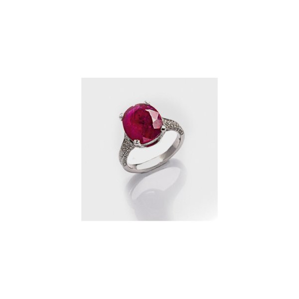 Weißgold, 18 ct.; Zentral besetzt mit einem unbehandelten, taubenblutroten Rubin von ca. 6,21 ct., flankiert von Diamanten von zus. 1,00 ct.; Gew. ca. 6,48 g.