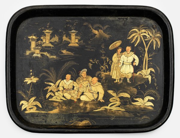 Weißblech mit teilw. erhabener Goldmalerei und roten Akzenten. Rechteckige Form mit gerundeten Ecken. Großer, flacher Spiegel mit ansteigendem, ausgestelltem und abgerundetem Rand. Im Spiegel dargestellt eine Seenlandschaft und Figurenstaffagen vor pagodenähnlicher Architektur und Palmen. 68 cm x 54,5 cm.