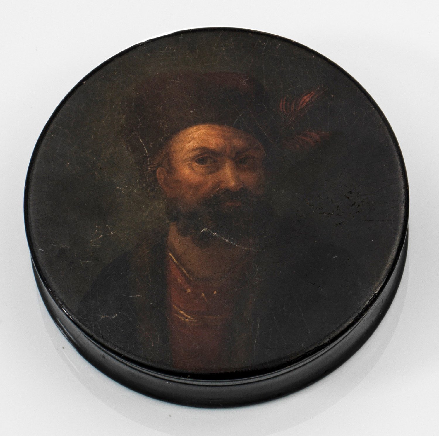 Pappmaché, schwarz lackiert. Runde Dose mit gering eingezogener Wandung. Der Deckel mit Brustbildnis eines bärtigen Mannes mit Pelzkappe mit roter Feder, rotem Gewand und Pelzmantel. Dunkler Hintergrund. Im Deckel Reste einer Inschrift. Nach Vorbild des Malers Christian Wilhelm Dietrich gen. Dietricy (1712-1774). Polychrome Lackmalerei. Krakelee. H. 2,2 cm. D. 10,3 cm.