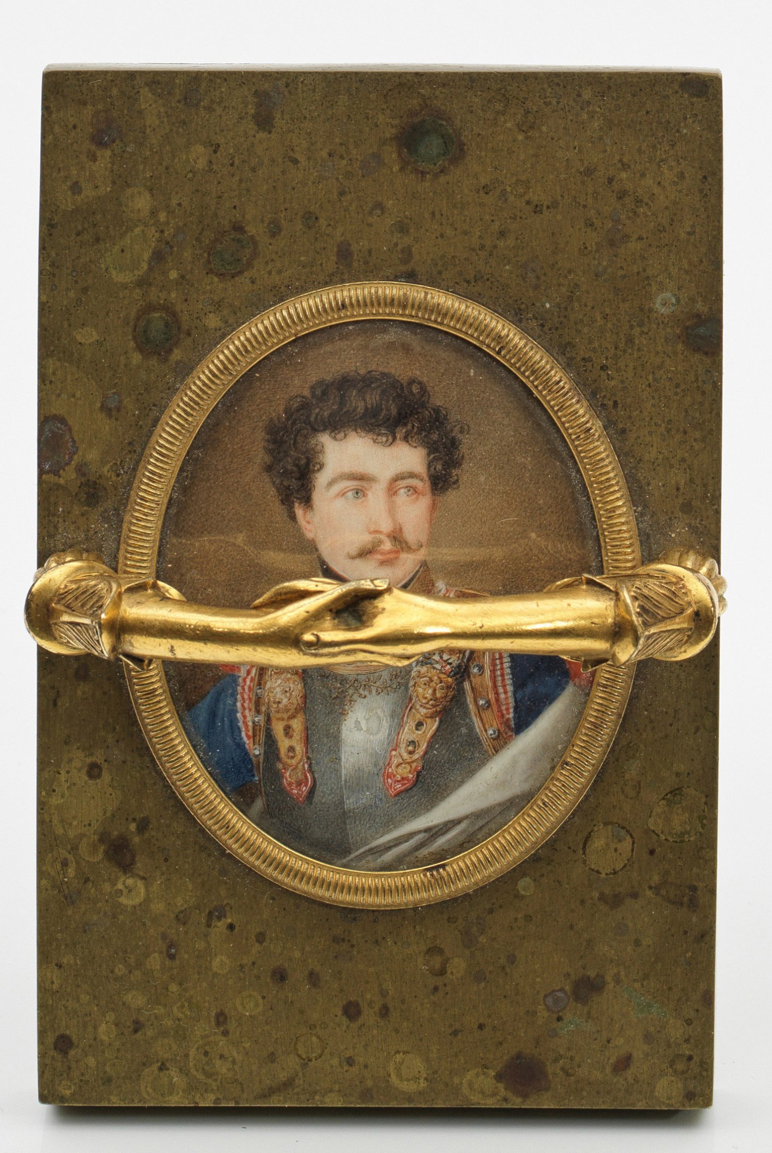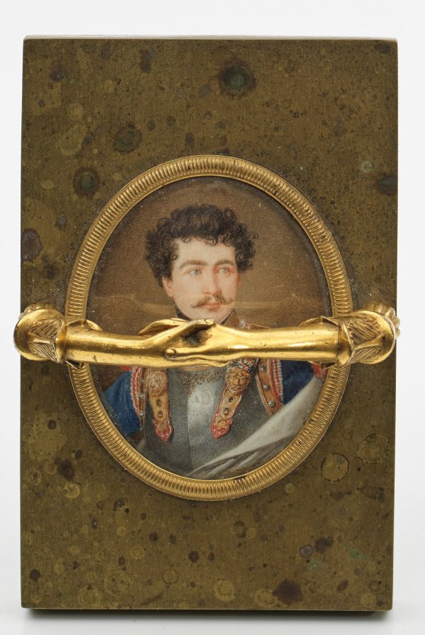 Messing. Hochrechteckige Form mit übergreifendem Henkel aus vollplastisch gestalteten, aus Blütenkelchen erwachsenden Armen, sich die Hände reichend. Darunter das ovale Brustbildnis des Prinzen mit gelocktem Haar und Schnurrbart. Bekleidet mit prächtigem Harnisch über blauer Jacke und eierschalfarbenem Umhang. Die Brust zieren, neben dem Ritterkreuz des Max Joseph-Ritterordens, u. a. das ihm 1814 verliehene Ritterkreuz des Militär-Maria-Theresien-Ordens als höchste militärische Auszeichnung der Habsburgermonarchie. Beigefarbener Hintergrund. Feine Temperamalerei. H. 8 cm. 16,5 cm x 11 cm. Miniatur: 8 cm x 7 cm.