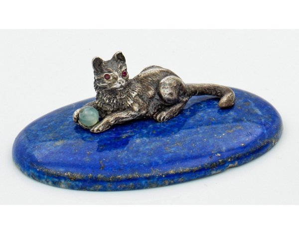 im Stil von Karl Fabergé. Silber. Auf ovalem flachem Sockel aus geschliffenem Lapislazuli die vollplastische Darstellung einer liegenden, mit einer Bergkristallperle spielenden Katze. Als Augen zwei Schmucksteincabochons. Gest. 84. H. 1,9 cm. 5,5 cm x 3,5 cm.