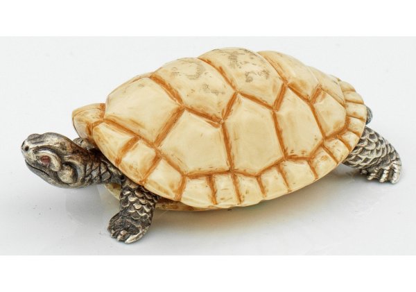 im Stil von Karl Fabergé. Silber und Mammut. Vollplastisch und naturalistisch gearbeitet in Gestalt einer Schildkröte mit erhobenem Kopf, die Augen besetzt mit zwei lachsfarbene Schmucksteincabochons. Gest. 84. Gew. ca. 55 g. H. 2 cm. L. 6,5 cm.