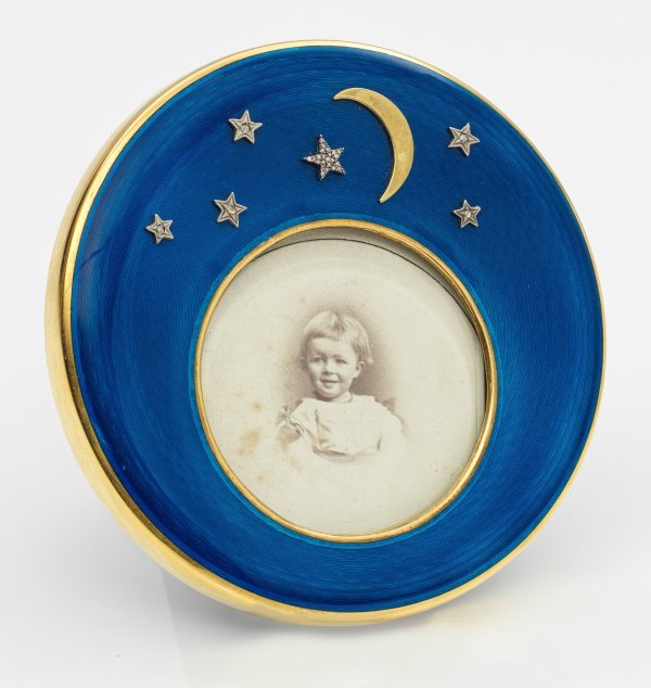 im Stil von Karl Fabergé. Silber, vergoldet und teilw. emailliert. Runde Form mit korrespondierendem Bildausschnitt. Schauseitig nachtblau emailliert über konzentrisch guillochiertem Grund. Oberhalb des Bildausschnitts ein applizierter Halbmond, umgeben von sechs Sternen, ausgefasst mit Diamantrosen. Rückseitig aufstellbar. Gest. 88. D. 11,5 cm. Bildausschnitt-D. 6,3 cm.