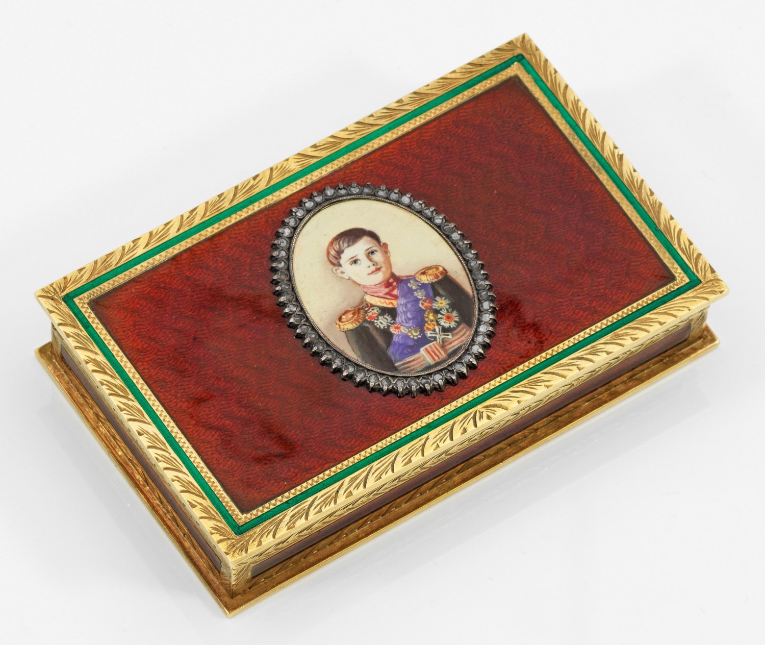 im Stil von Karl Fabergé. Silber, vergoldet. Rechteckiger Korpus mit gerader Wandung. Scharnierter Deckel rostrot emailliert und wellenförmig guillochiert. Der ausgestellte Rand mit ziseliertem Blattwerk verziert und akzentuiert von grünem Emailleband. Zentral ein appliziertes, ovales Medaillon mit Porträt von Zarewitsch Alexei Nikolajewitsch Romanow (1860-1920), gerahmt von Diamantrosen. Gest. 88. Gew. ca. 260 g. H. 1,8 cm. 10 cm x 6 cm.