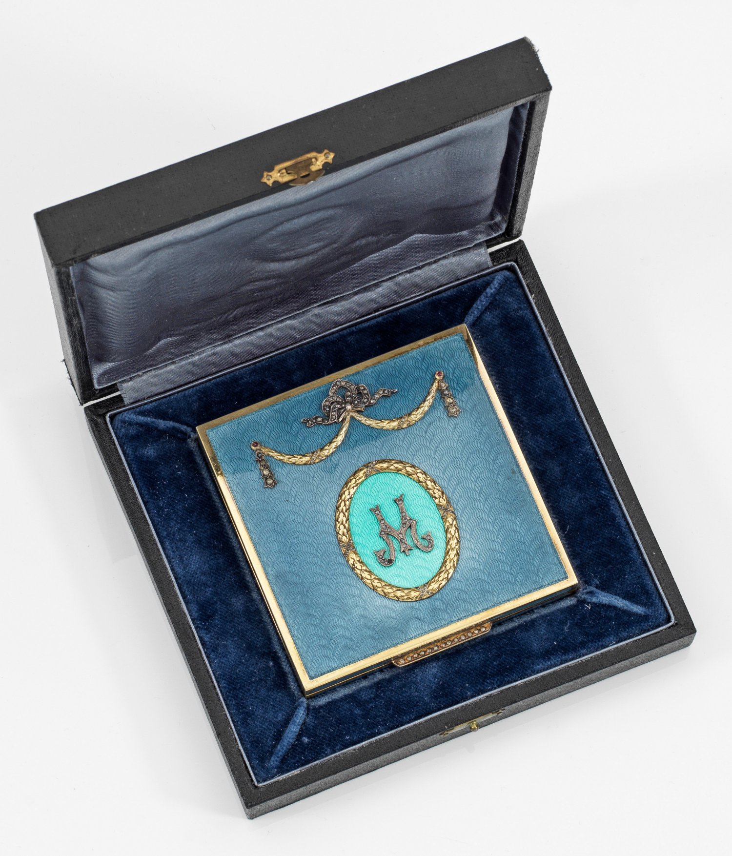 im Stil von Karl Fabergé. Silber, vergoldet. Mit Etui. Quadratische Form. Wandung und Deckel über wellenförmig guillochiertem Grund hellgrau emailliert. Auf dem scharnierten Deckel mittig ein Ovalmedaillon mit appliziertem "M" über helltürkisem Grund, gerahmt von reliefplastischem Blattkranz und Kreuzbanddekor. Darüber eine reliefierte Schleife mit korrespondierenden Blattkranzfestons mit Diamantrosen ausgefasst. Linearer Drücker ebenfalls mit Diamantrosen besetzt. Gest. 88. Gew. ca. 455 g. 2 cm. 10 cm x 10,2 cm.