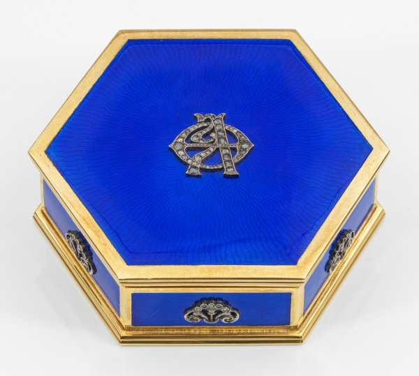 im Stil von Karl Fabergé. Mit Holzetui. Silber, vergoldet und emailliert. Sechsfach gekanteter Korpus mit gerader Wandung und gering ausgestelltem, gestuftem Stand und Deckelrand. Wandung und scharnierter Deckel royalblau emailliert über fein guillochiertem, strahlenförmigem Grund. Auf dem Deckel zentral appliziertes, kyrillisches Monogramm ausgefasst mit Diamantrosen. Die Wandung verziert mit stilisierten Zierschalen über volutierten Akanthusblättern. Gest. 88. Gew. ca. 370 g. H. 3,4 cm. 9,2 cm x 9,2 cm.