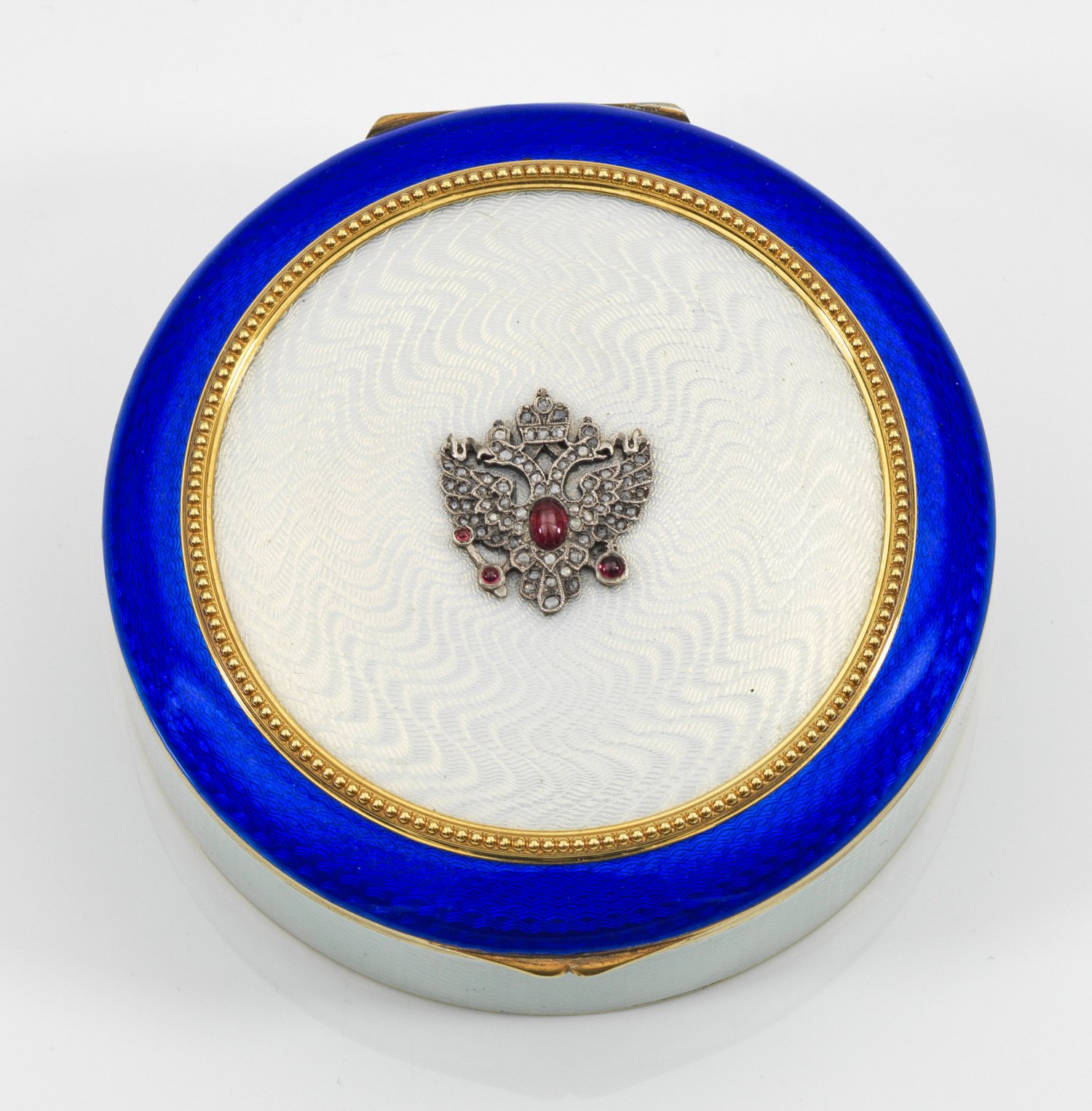 im Stil von Karl Fabergé. Silber, teilw. vergoldet und emailliert. Runde Form mit gering aufgewölbtem, scharniertem Deckel. Zentral applizierter, mit Granatcabochons und Diamantrosen besetzter Doppeladler über weiß emailliertem und wellenförmig guillochiertem Fond. Randzone abgesetzt durch reliefplastisches Perlfries und umzogen von blau emailliertem, breitem Band. Wandung korrespondierend weiß emailliert. Gest. 88. Gew. ca. 240 g. H. 3,4 cm. D. 9,7 cm.