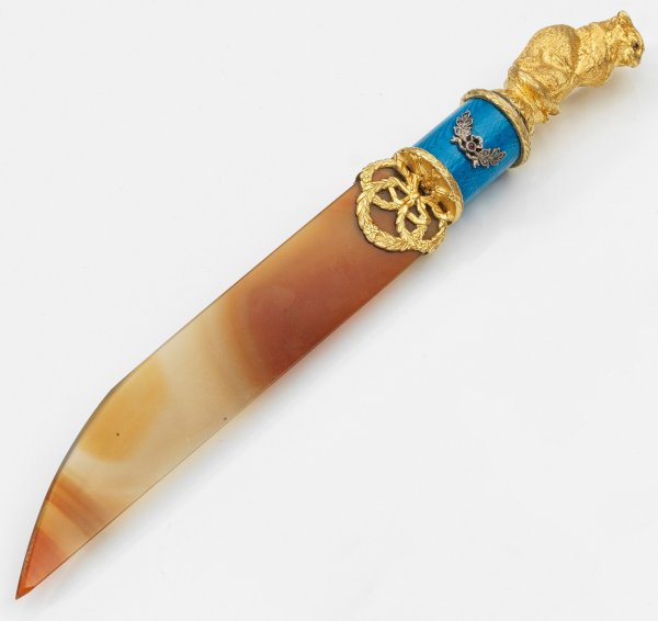 im Stil von Karl Fabergé. Silber, teilw. vergoldet. Konische Klinge aus honig- bis dunkel orangefarbenem Bandachat, am Ansatz gefasst von drei sich überschneidenden, stilisierten Lorbeerblattkränzen. Zylindrischer Griff mit appliziertem und mit Diamantrosen ausgefasstem Lorbeerzweig über türkisfarben emailliertem Grund. Als Abschluss eine vollplastisch gestaltete, sitzende Katze mit kleinen Schmucksteincabochons als Augen. Gest. 88. L. 23 cm.