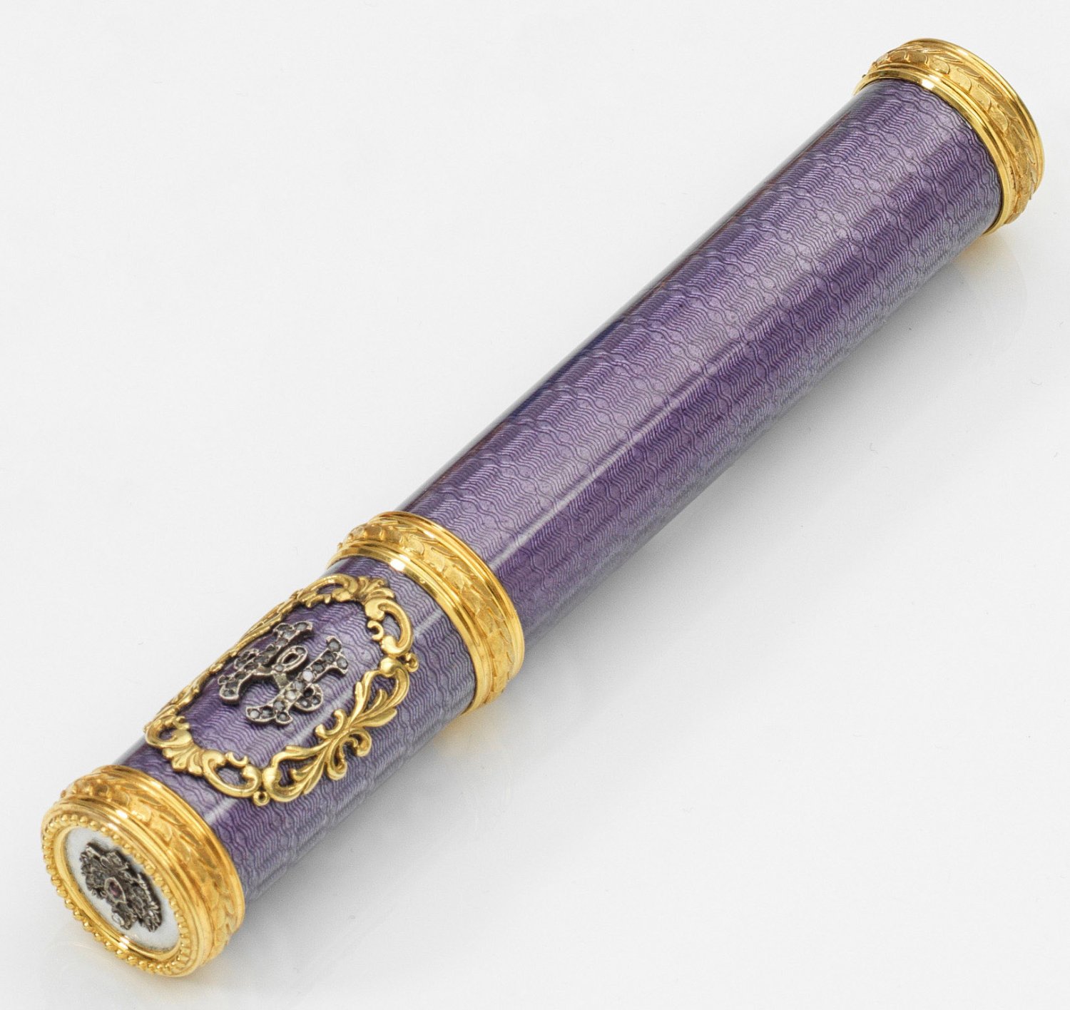 im Stil von Karl Fabergé. Silber. Zylindrische Form mit Stulpdeckel. Umlaufend fliederfarben emailliert über feinem, wellenförmig guillochiertem Grund. Der Deckel schauseitig mit aufgelegtem Monogramm, ausgefasst mit Diamantrosen und gerahmt von C-Schwüngen und Voluten im Oval. Die Ränder umzogen von reliefierten Bändern aus stilisiertem Lorbeerkranzdekor und Perlfries. Auf der Deckeloberseite ein applizierter Doppelkopfadler über weiß emailliertem Grund. Gest. 88. Gew. ca. 150 g. L. 16,5 cm.