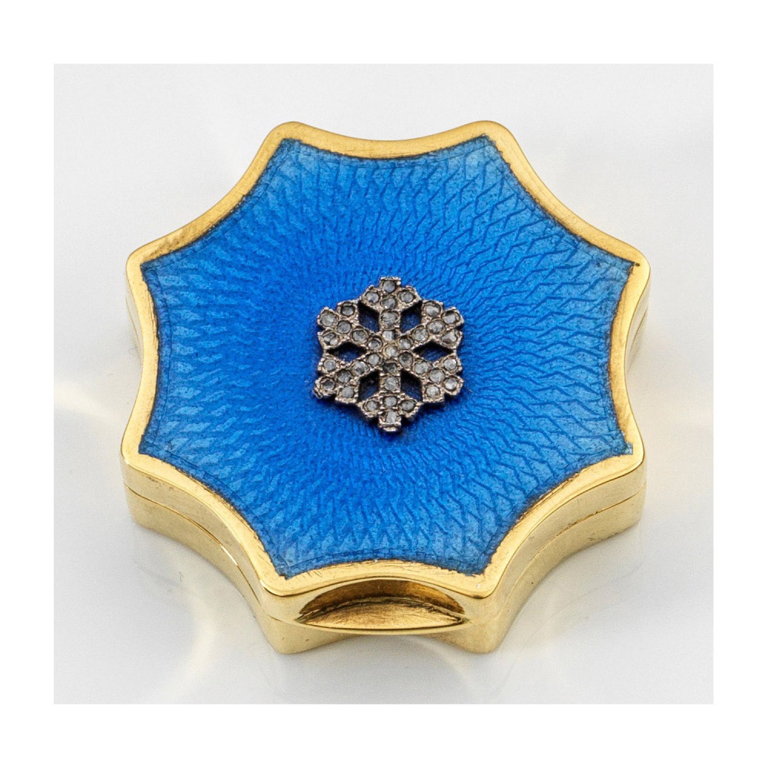 im Stil von Karl Fabergé. Silber, vergoldet und teilw. emailliert. Runder Korpus mit achtfach, sternförmig eingezogener Wandung. Auf dem flachen Deckel applizierte Schneeflocke, ausgefasst mit kleinen Diamantrosen über guillochiertem, hellblau emailliertem Grund. Gest. 88. Gew. ca. 35 g. H. 1,2 cm. D. 3,1 cm.