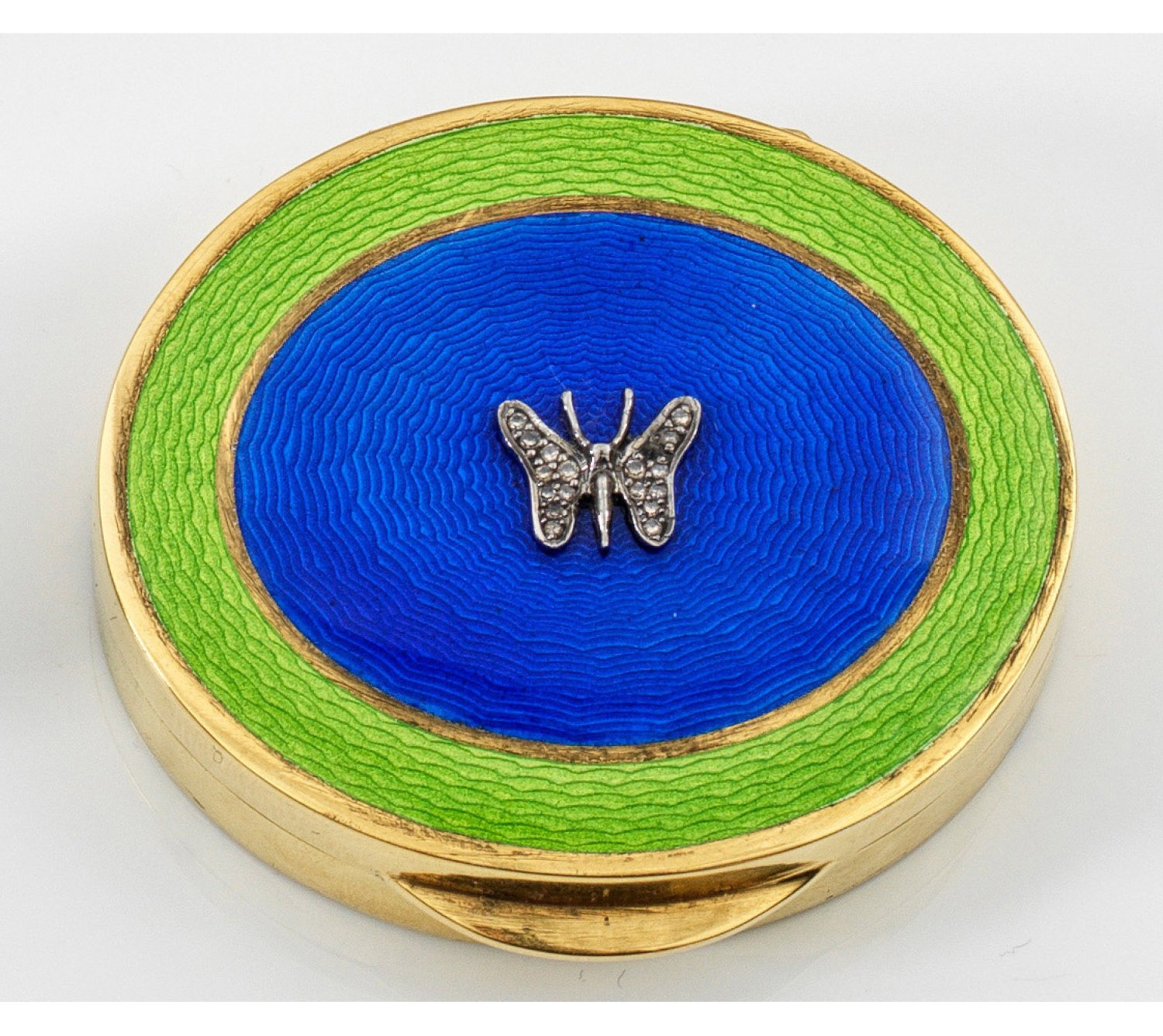 im Stil von Karl Fabergé. Silber, vergoldet und emailliert. Ovaler Korpus mit scharniertem, gering gewölbtem Deckel. Zentral ein applizierter Schmetterling, ausgefasst mit Diamantrosen über blau emailliertem und wellenförmig guillochiertem Grund. Umlaufend ein lindgrünes, emailliertes Band mit goldener Profillinie. Gest. 88. Gew. ca. 65 g. H. 1,5 cm. 4,7 cm x 4,2 cm.