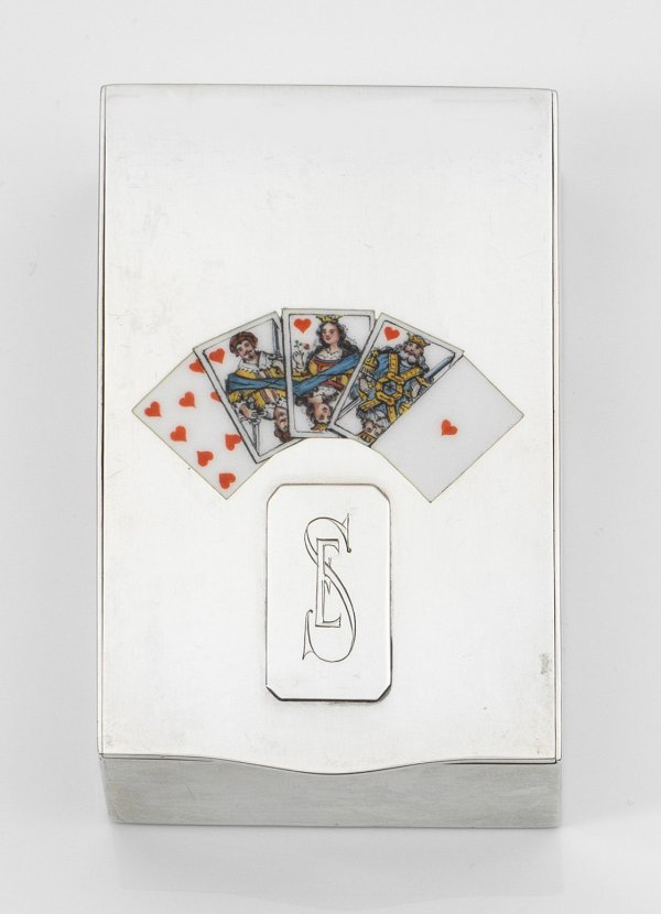 Silber. Hochrechteckige Kastenform mit flachem Scharnierdeckel. Zentral fünf polychrom emaillierte Spielkarten. Herz-Zehn, -Ass, -König, -Dame und -Bube über gekanteter Kartusche mit graviertem Monogramm "ES". Gest. 900, Herstellerzeichen, russische Repunzierung seit 1908. Gew. ca. 210 g. H. 1 cm. 8 cm x 6,5 cm.