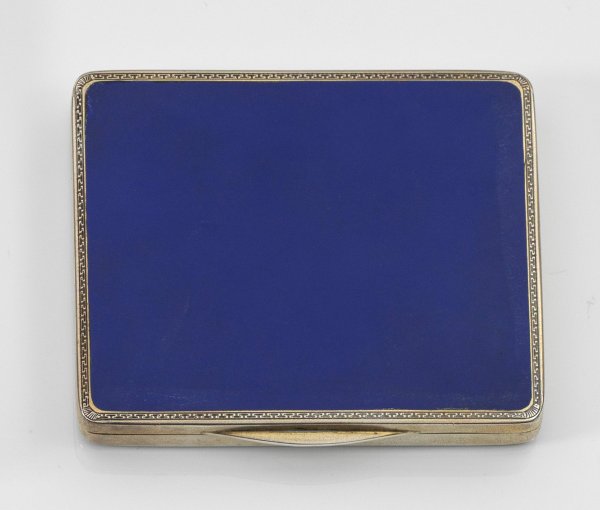 Silber. Rechteckige, flache Form mit scharniertem Deckel. Schmaler, geschweifter Drücker. Ober- und Unterseite mattblau emailliert. Der Rand umzogen von schmalem, reliefiertem Mäanderband. Innen vergoldet, mit gravierter und dat. Widmung. Minim. best.; Gest. 900, Herstellerzeichen. Gew. ca. 145 g. H. 1 cm. 8 cm x 6,5 cm.