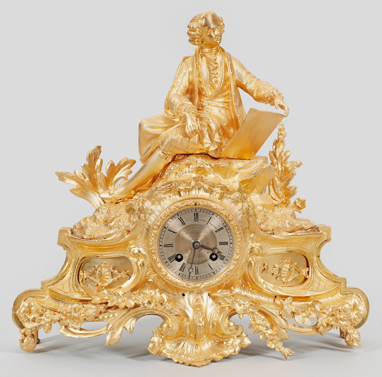 Bronze, vergoldet. Vollplastische Darstellung eines jungen Künstlers als Bekrönung für geschweift ansteigendes Uhrengehäuse aus üppigen Blattvoluten und Rocaillen. Profilgerahmtes Zifferblatt. Pendulenwerk mit Pendelfeder sowie Halbstundenschlag auf Glocke. Gehäuse bez. A. Adan. H. 38 cm. 41 cm x 10 cm