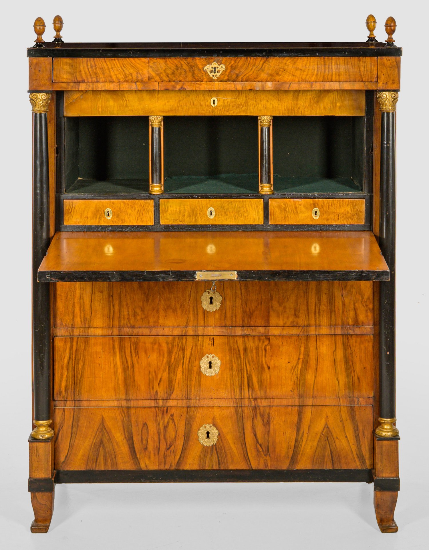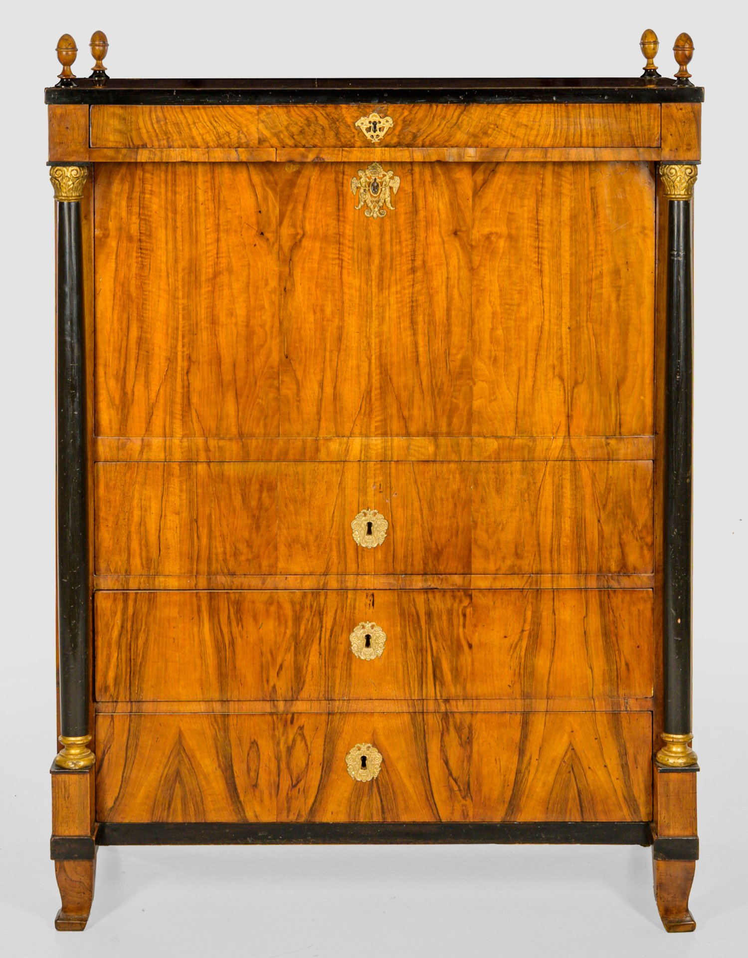 Nussbaum, furniert und teilw. ebonisiert bzw. geschnitzt, gefasst und vergoldet. Gerader, hochrechteckiger Korpus, flankiert von eingestellten, konischen Vollsäulen mit reliefierten Kapitellen auf schmaler Zarge und geschweiften Beinen. In der gegliederten Front vier, teilw. vorkragende Schubladen unterschiedlicher Größe sowie abklappbare Arbeitsfläche. Dahinter gestaffelte Facheinteilung. Gering überstehende Deckplatte sowie Knaufbekrönungen. H. 140 cm. 100,5 cm x 50 cm.