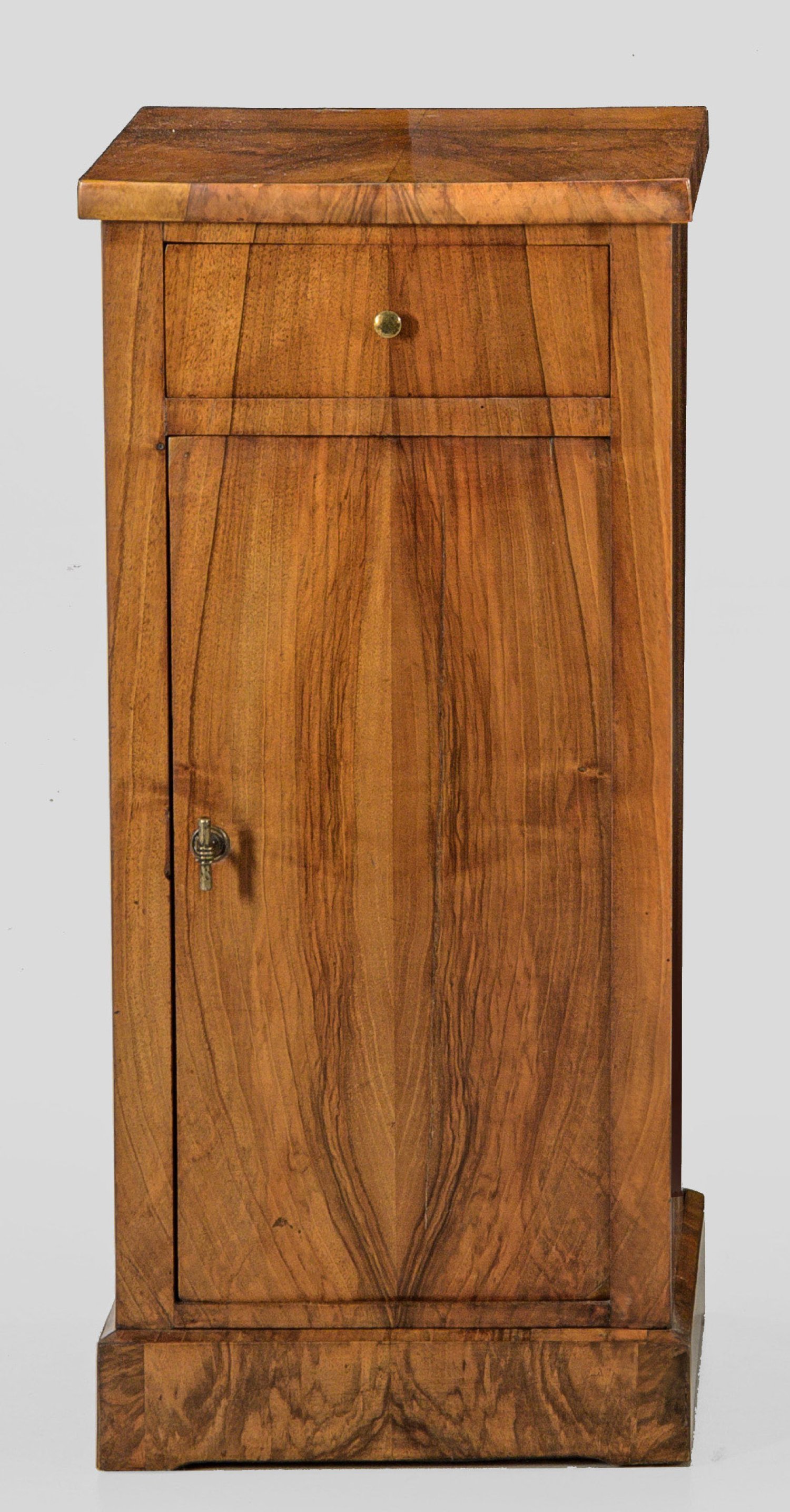 Nussbaum, furniert. Gerader, rechteckiger Korpus auf gekantetem Zargensockel. In der gegliederten Front schmale Tür sowie oberhalb Schubfach. Gering überstehende Deckplatte. Allseitig flächendeckende Furnierfelder. H. 80,5 cm. 36 cm x 36 cm.