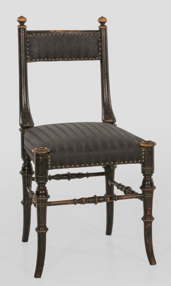 Holz, ebonisiert. Trapezförmige Zarge auf mehrfach gegliederten, ausgestellten Beinen, durch schmale, korrespondierende Stege verbunden. Zurückschwingende Rückenlehnenrahmung aus gerundeten, sich konisch verjüngenden Streben sowie breitem oberen Abschluss. Sitzfläche gepolstert und bezogen. Sitz-H. 46 cm.