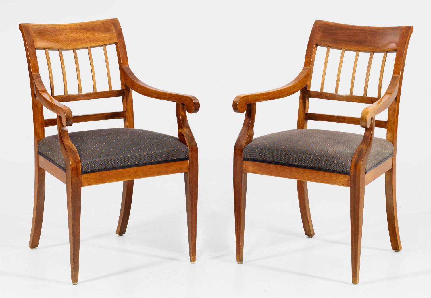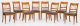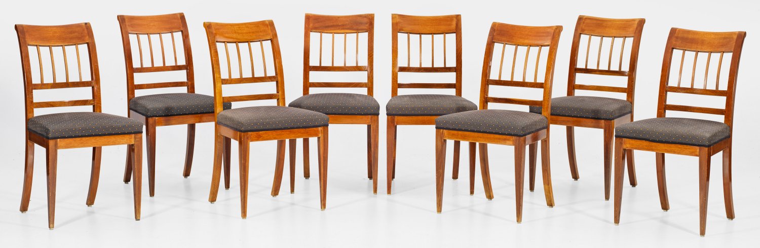 10-tlg.; Paar Armlehnstühle und acht Stühle. Helles Mahagoni. Trapezförmige Zarge auf konischen Vierkantbeinen. Kurze Stütze für schmale Armlehnen sowie leicht zurückschwingende Rückenlehnen mit breitem oberem Abschluss. Sitzfläche gepolstert und bezogen. Sitz-H. 47 cm.