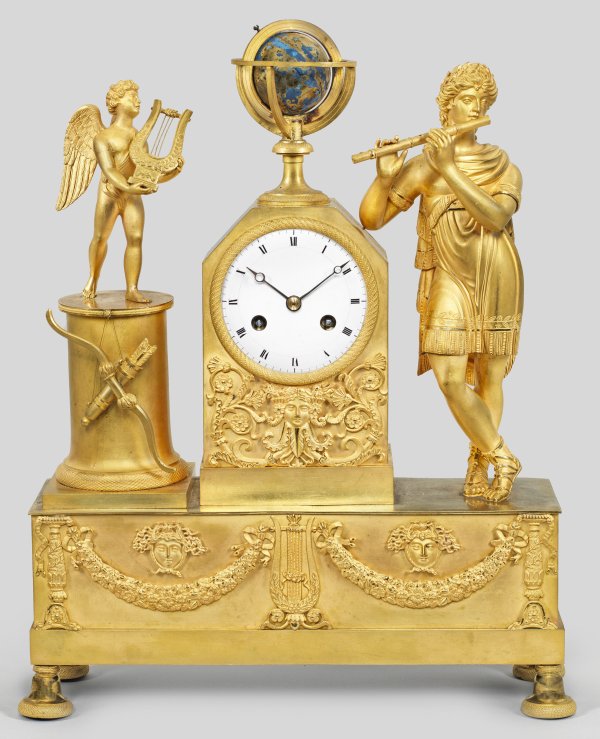 Bronze, vergoldet. Vollplastische Darstellung eines jungen, antikisierenden Flötenspielers, an das gekantete Uhrengehäuse mit applizierten Volutenmotiven und Bekrönung in Form eines Globus gelehnt. Gegenüber auf hohem, kräftigen Säulenstumpf kleiner Amorknabe mit Lyra. Profilgerahmtes, weißes Emailzifferblatt. Unterhalb breiter Sockel mit erhaben reliefierten Festons. Pendulenwerk mit Fadenaufhängung und Halbstundenschlag auf Glocke. H. 45,5 cm. 35 cm x 10 cm.