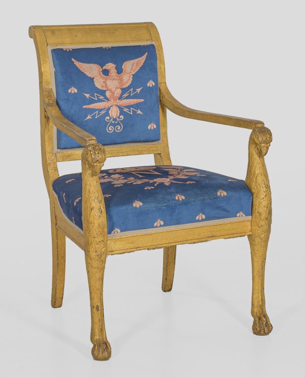 Holz, geschnitzt, gefasst und vergoldet. Trapezförmige Zarge, flankiert von plastisch gestalteten Adlern als Stütze für geschweift ansteigende Armlehnen sowie in leicht ausgestellte Beine mit Klauenfüßen übergehend. Rechteckige, zurückschwingende Rückenlehne mit breitem oberen Abschluss. Gepolstert und neuzeitlich im napoleonischen Stil bezogen. H. 90 cm. 60 cm x 64 cm. Sitz-H. 45 cm.