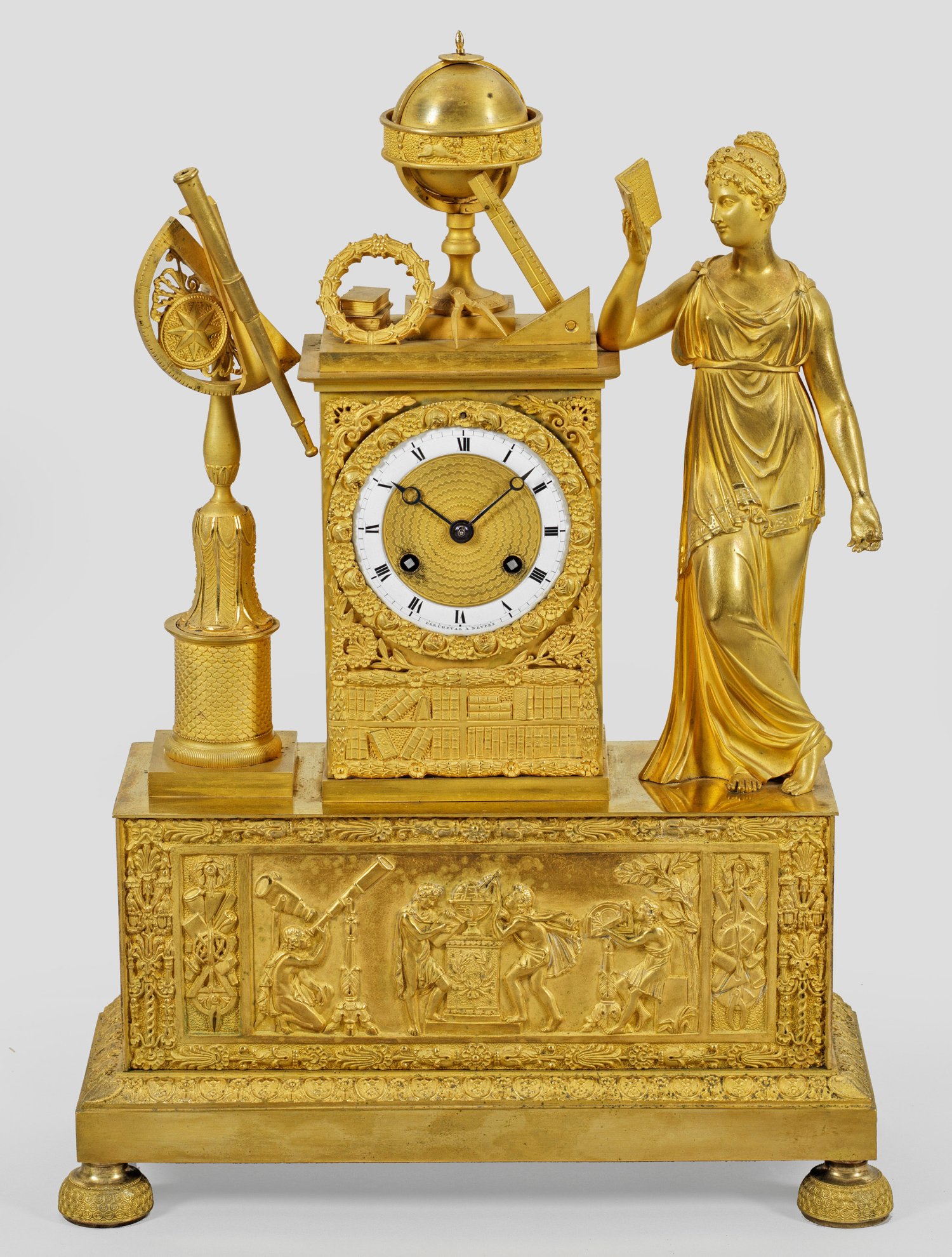 Bronze, vergoldet. Hoher, querrechteckig angelegter Sockel mit breitem Fries aus forschenden Knaben. Oberhalb hochrechteckiges Uhrengehäuse mit erhaben reliefierten Buchrücken sowie Bekrönung aus Attributen der Wissenschaft. Daneben vollplastische Darstellung einer lesenden jungen Dame sowie Fernrohr. Von Rosenblüten gerahmtes Ziffernblatt mit Emailziffernring, bez. Per Cheval à Nevres. Pendulenwerk mit Fadenaufhängung sowie Halbstundenschlag auf Glocke. H. 47,5 cm. 32 cm x 12 cm.