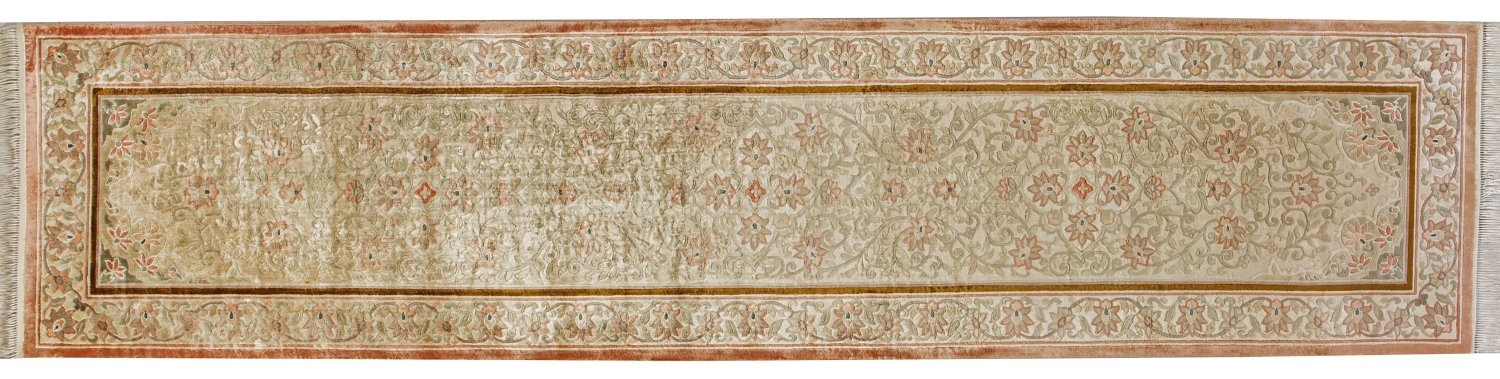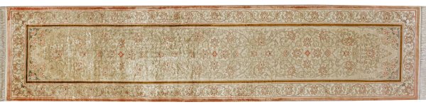 China. Seide auf Baumwolle. Im cremefarbenen Innenfeld flächendeckende Musterung aus ornamental angeordneten Blattranken. Umlaufend korrespondierende Bordüre, von hellroten Bändern begrenzt. 305 cm x 69 cm.