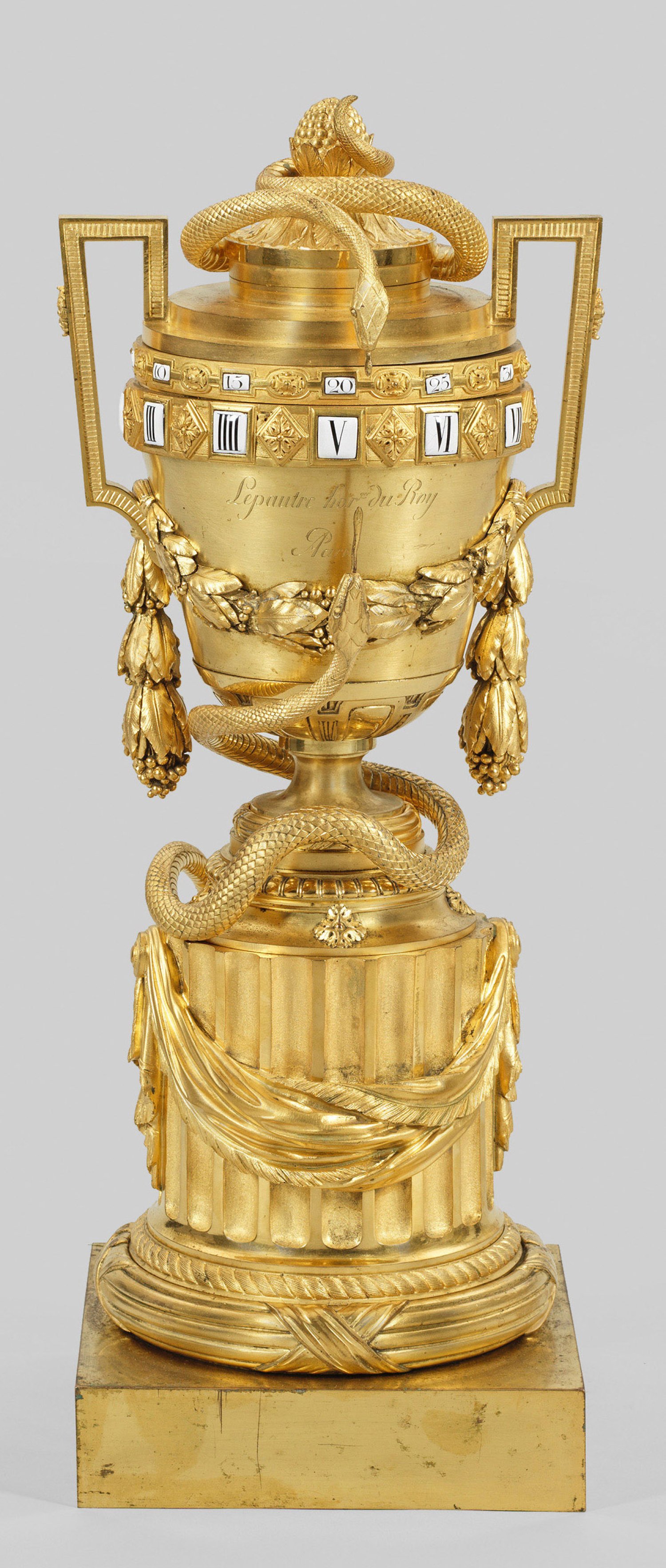 sog. "Pendule à cercle tournant". Vergoldete Bronze. Über quadratischer Plinthe kräftiger, tief kannelierter Säulenschaft mit Basis aus gebündelten sowie schauseitig üppigem Draperiewerk. Oberhalb vasenförmiger Uhrenkorpus mit Knaufbekrönung sowie seitlich gekanteten Henkeln, verbunden von Lorbeerfestons. Umlaufend zwei Ziffernringe mit römischen und arabischen schwarzen Zahlen auf gekanteten Emailreserven sowie den Korpus umwindendes Schlangenpaar, mit ihren Zungen auf die verstreichende Zeit weisend. Korpus bez. Lepaute Horloger du Roy Paris. H. 58 cm. 21 cm x 21 cm.