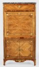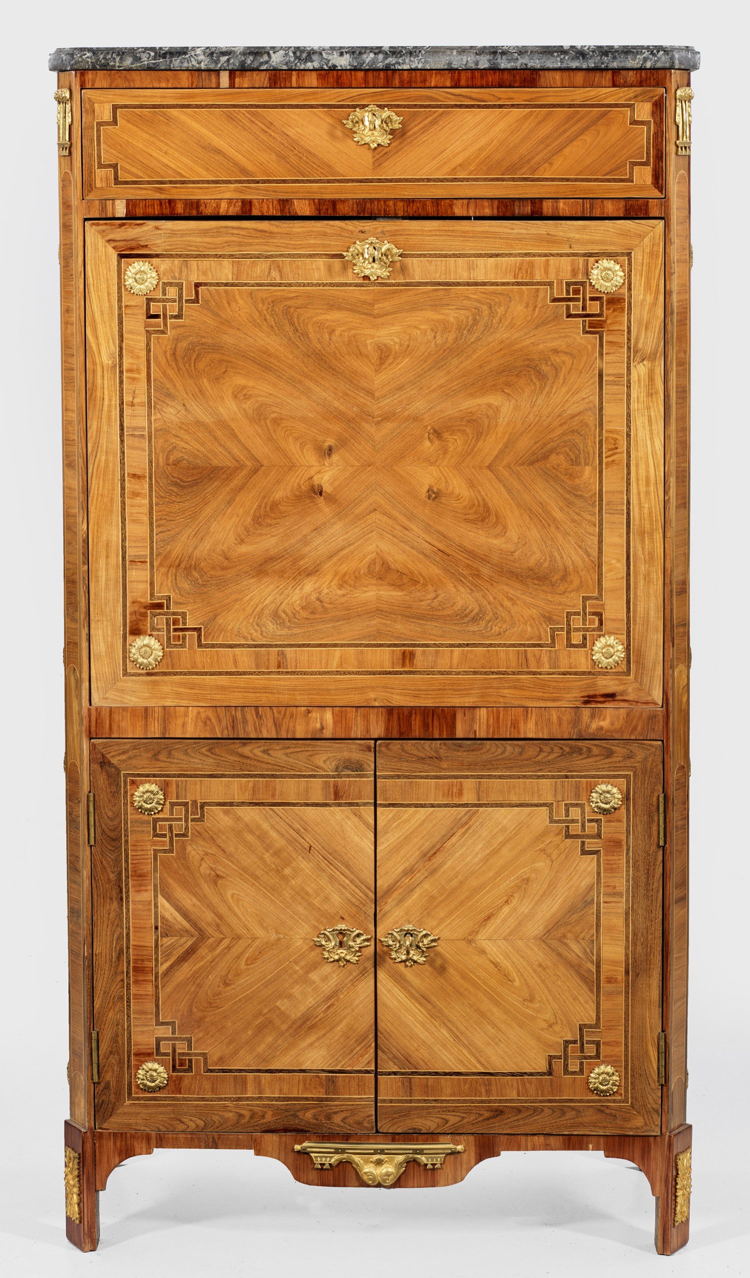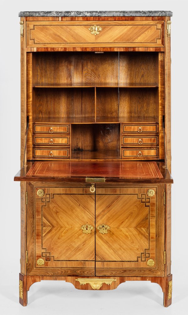 Palisander und Nussbaum, furniert sowie Einlagen aus Ebenholz. Gerader, hochrechteckiger Korpus, flankiert von schräggestellten Ecklisenen, in gekantete Füße übergehend. In der gegliederten Front zwei optisch verbundene Türen sowie abklappbare Arbeitsfläche dahinter gestaffelte Facheinteilung sowie Arbeitsfläche aus goldgeprägtem rotem Leder. Oberhalb breites Schubfach. Flächendeckend breit gerahmte, gespiegelt angeordnete Furnierfelder von teilw. mäanderförmig angelegten Bandeinlagen begrenzt. Applikationen aus vergoldeter Bronze. Korrespondierende Deckplatte aus graugemasertem Marmor. Schlagstempel Sign. I*S*REBOUR (wird Meister 1767) sowie Pariser Jury-Stempel JME. Lichtspuren. H. 148 cm. 78 cm x 40 cm.