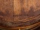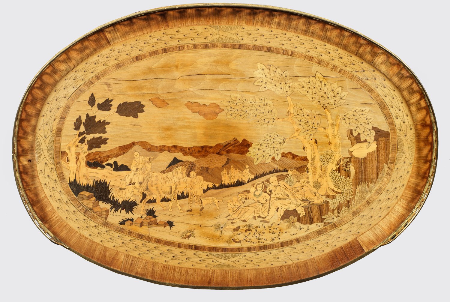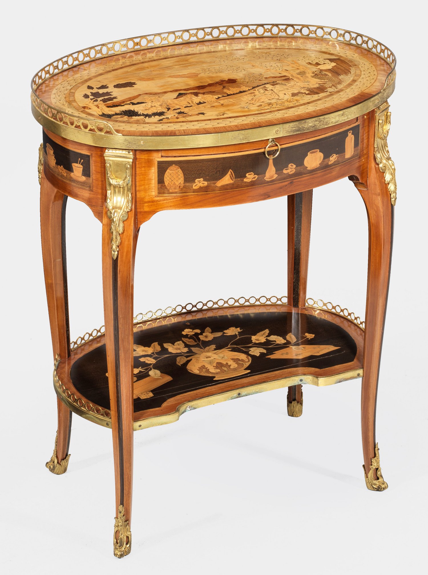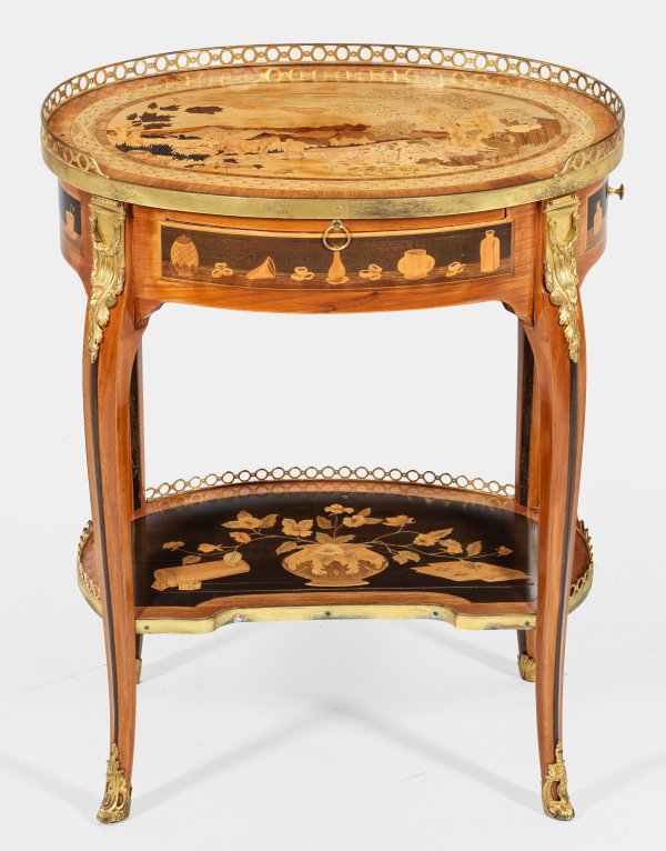 Rosenholz, furniert sowie reiche Marketerie aus unterschiedlichen teilw. gefärbten Edelhölzern. Bombierter Korpus mit ausziehbarer Arbeitsfläche und seitlichem Schubfach auf geschweiften Beinen, unterhalb durch eingezogenes Ablagefach mit eingelegtem Vasenmotiv, Würfeln und Spielkarten verbunden. Gering überstehende, ovale, galeriegerahmte Deckplatte mit breit gerahmter, intarsierter Chinoiserie aus rastender Gruppe mit Pferden in weiter, baumbestandener Landschaft. Allseitig gerahmte Reserven mit unterschiedlichen intarsierten Gefäßen. Schlagstempel C.TOPINO (wird Meister 1773) sowie Pariser Jury-Stempel JME und altes Besitzeretikett. Lichtspuren. H. 74 cm. 59,5 cm x 41 cm.