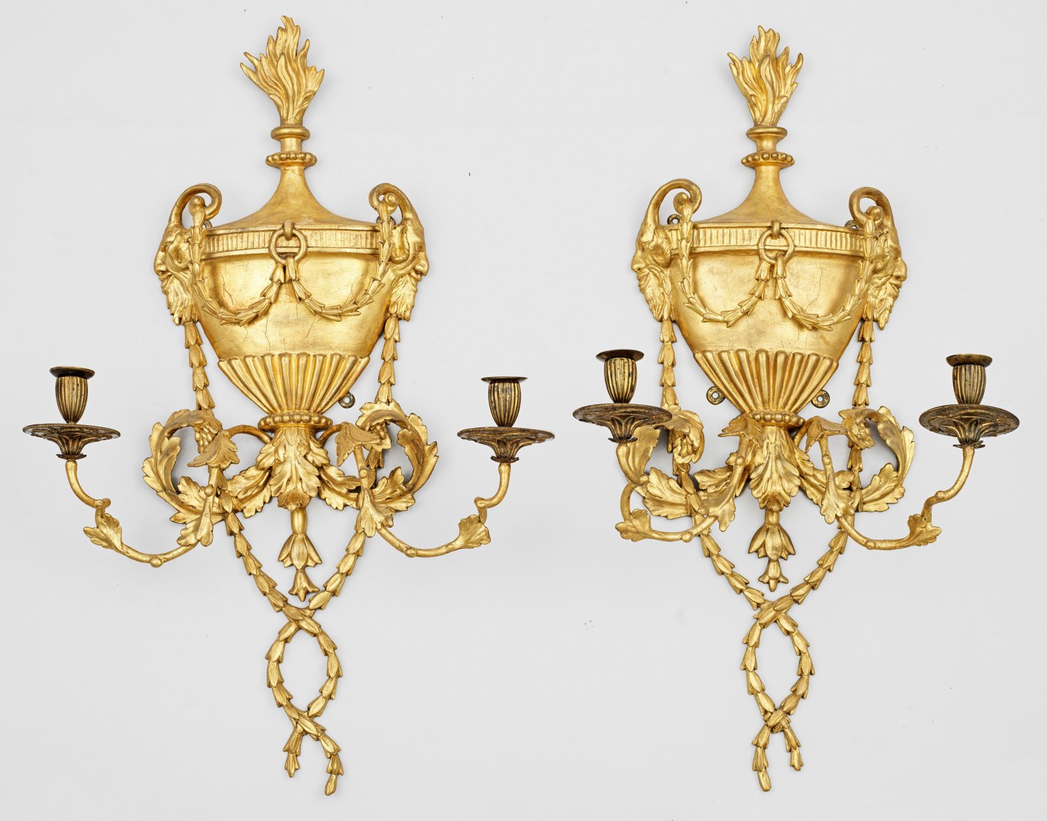 2-flg.; Holz, stuckiert, gefasst und vergoldet. Flaches, balusterförmiges, teilw. godroniertes Wandschild in Form einer Vase mit Flammenbekrönung. Seitlich reliefplastische Bocksköpfe, durch üppige und weit herabfallende Lorbeerfestons verbunden. Davon ausgehend stark geschwungene Leuchterarme aus Astwerk als Träger für vasenförmige, umlaufend godronierte Tüllen über fein dekorierten Traufschalen aus Messing. Rückseitig Etikett Sotheby's Belgravia. H. 73 cm.