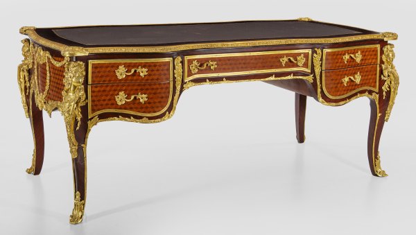 Palisander furniert sowie üppige Applikationen aus vergoldeter Bronze. Allseitig bombierter, passig geschweifter Korpus, flankiert von Ecklisenen mit vollplastisch gestalteten Hermenfiguren auf geschwungenen Beinen. In der gegliederten Front breites Kniefach, umgeben von vier Schubladen unterschiedlicher Größe. Allseitig profilgerahmte Furnierfelder aus Rautenmarketerie. Profilgerahmte Deckplatte mit schokoladenbrauner Arbeitsfläche. H. 81 cm. 188 cm x 98 cm.