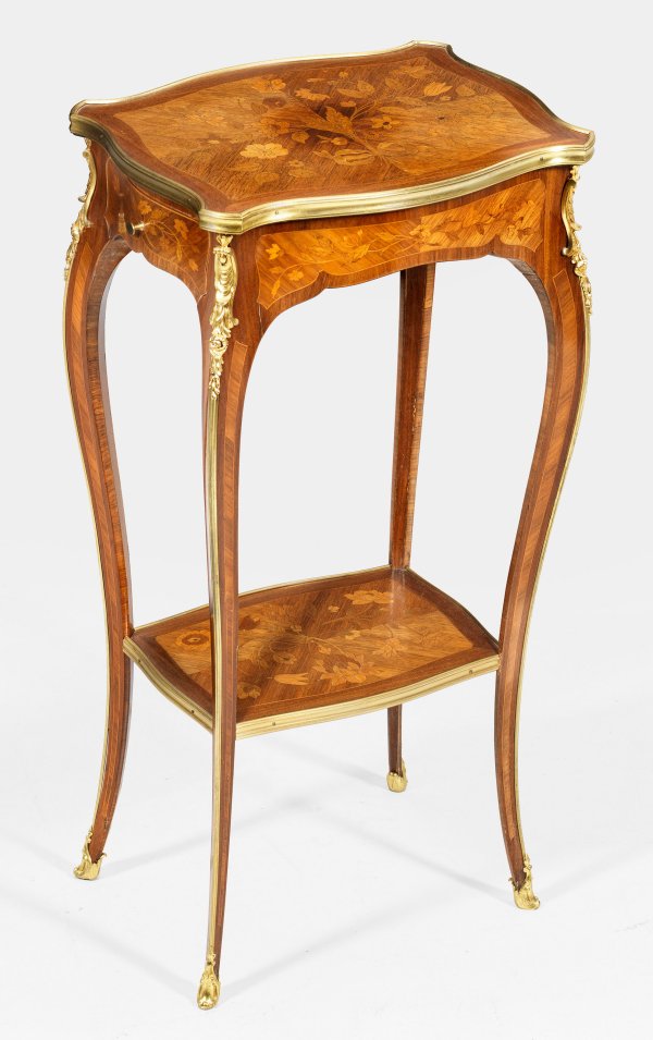Königsholz und Mahagoni, furniert mit Einlagen aus unterschiedlichen Edelhölzern. Allseitig leicht bombierter, einschübiger Zargenkasten auf schlanken, elegant geschwungenen Beinen, verbunden durch Ablagefach. Korrespondierende, profilgerahmte Deckplatte. Allseitig breit gerahmte, gespiegelt angeordnete Furnierfelder mit üppigem Blütendekor, von Fadeneinlagen begrenzt. Applikationen aus vergoldeter Bronze. Unterhalb Schlagstempel-Sign. G. DURAND. H. 72 cm. 29 cm x 36 cm.