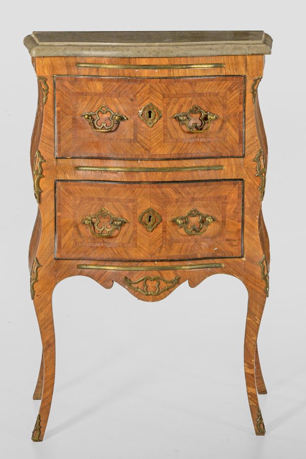 Nussbaum, furniert. Dreiseitig bombierter Korpus, flankiert von geschweiften Ecklisenen, in hohe, geschwungene Beine übergehend. In der gegliederten Front zwei Schubfächer sowie Traversen mit eingelegten Messingkanneluren. Flächendeckend breit gerahmte, gespiegelt angeordnete Furnierfelder. Eingelegte Deckplatte aus sog. Rosa Tea Marmor sowie als Ergänzung aufgelegte Deckplatte aus grauem Marmor. H. 87/89,5 cm. 56,5/59 cm x 37/38 cm.